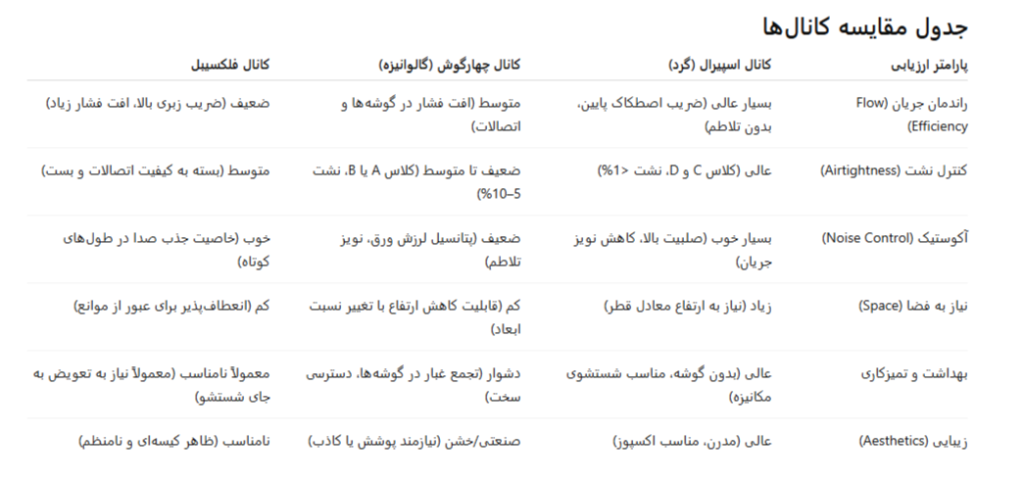 در این گزارش، با تکیه بر دادههای فنی منابع معتبر بینالمللی مانند SMACNA و ASHRAE و با تطبیق رویهها با مبحث ۱۴ مقررات ملی ساختمان ایران، سه فناوری غالب کانالسازی — کانال اسپیرال (گرد)، کانال چهارگوش (گالوانیزه) و کانال فلکسیبل — را بررسی کردهایم. هر فناوری را از منظر هدررفت فشار و انرژی، نشت هوا، رفتار آکوستیک، قابلیت نصب و نگهداری و هزینههای عملیاتی تحلیل کردهایم.